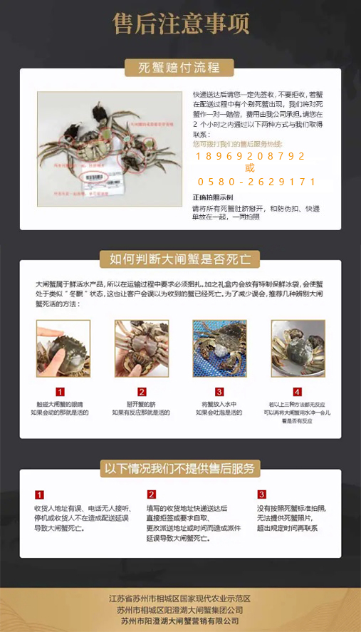 2.>快递送达后请您一定要先签收,并开箱检验,如有死蟹当天签收,当天两小时内联系我们(拍摄死蟹照片给我们,拍照要求如下图)才享受赔付哦!联系电话:18969208792或0580-2629171.